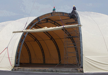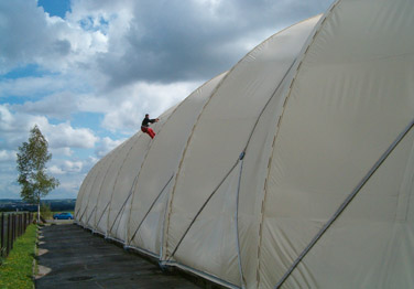 Vollständige Erneuerung der Textilhaut an insgesamt 3 Hallen mit Grundflächen von 1300-1500m