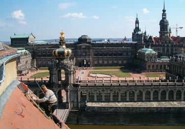 Montage der 3 m hohen Sandsteinfigur "Georg der Bärtige" (1471-1539 Herzog von Sachsen)
